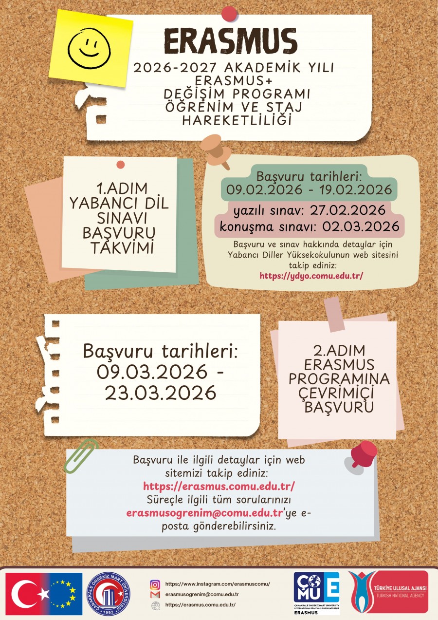 II. adım olan Erasmus+ Programı'na başvurular, yabancı dil sınavından sonra, 09.03.2026 – 23.03.2026 tarihlerinde gerçekleşecektir.